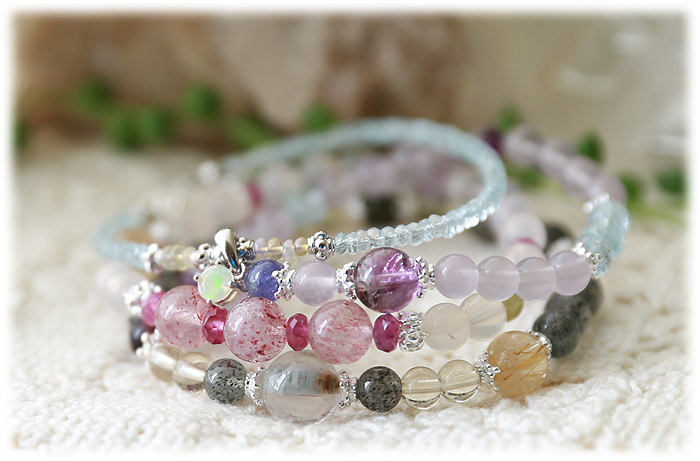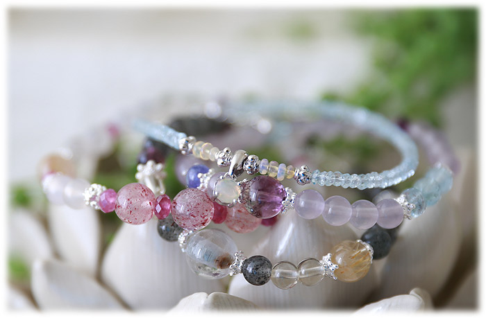 ![]() ![]() 2013年11月・・・8年ぶりに また 出会うことができた ブラジル産のアメジストエレスチャル。 時代のサイクルが 強く動き出すサインだなぁ・・と感じながら手にとった石。 ストーンメッセージを読み返してみると 変容の力強い動きの訪れを確信しました。 思考で考えて 変換する 心を置き去りにして頑張ってきた過去を背負う私達だから 2014年は導きの多い年だから過去を糧に不思議な展開を起こしてくれる パープルのフローライトをベースに・・・ 潜在意識下で望んでいるものに 動きや変化の導きが起こりますように・・・と願って。 人と調和して生み出していく時代 柔軟性を培う今年に コミニケーション能力を高めていくサポートを・・・ 青紫のタンザナイトは 望む幸せへと導きながら 少々困難な問題に立ち向かう時でも 不安や失望感で自分を追い込まず 崇高な光で洗い流すように サポートし安定させてくれるブルートパーズを添えて・・・ 今 あなたに 大きな変容の流れがきています。 そのチャンスを あなたが活かし ここからの糧にしていけますように・・・ *-----------------------------------------------------------------------------------* エレスチャルは 数千年以上の時を経て この姿になって 私達の前に現われてくれたストーンです。 気の遠くなるような時間 その時の環境の変化 想像をこえるような時代の変化の中 全てを越えて存在を続けたストーンです。 このパワフルで そしてこの雄大さ 温かさは 全てのことを経た経過をエネルギーに変えた強さなのかもしれないと エレスチャルを眺めるたびに感じるのです。 いつも 心で葛藤する私達に 天使は 『自分に理想を持ってください。 そして 存在し続けてください』とメッセージを贈ってくれているように感じます。 私達に何かを伝えにきてくれたエレスチャルは いつも 眺められる場所に 存在していてほしいと思います。 魂が望む出会いの形を完成させて あなたの人生を拡げていく・・・ 出会いの種類は 人とだけではなく あなたを刺激させて 心をいい意味で高ぶらせる そんな出来事も含めています。 一人では 感じることのできないもの・・・ 今は 想像できないもの 人生に必要なもの それらと惹き合い 人生を創る。 過去という歴史が あなたに何故 必要だったのかを 知るためのスタートが 始まります。 *-----------------------------------------------------------------------------------* ![]() ![]() ![]() 過去があるから今がある・・・ 人は 準備が整ったとき 不思議だなぁと思う展開に出会います。 魂の約束。 自分がこの世に生まれ 自然に浮かび上がる こうしよう や こうしたい 心で抑え込まず 進んでしまうとき 魂の役割が始まり あなたに どんどん 変容が起こってきます。 2014年は その役割をしていくとき 成長した自分を見ていく向上心・・・ 心から溢れる 思いと流れが重なって こんな年ってあるんだと感じることのできる2014年は 2013年の8月から 変革 変容の勢いが強くなってきています。 あなたが望む生き方へと・・・ 必要な人と出会い 知らなかったことを知り 愛を疑わず 自分らしさを知って たくさんの学びと喜びを持って 魂の輝きを 増していってください。 あなたの今からは あなたが望んできたように 大きく変化しながら あなたを満たしていってくれるでしょう。 後で考えると・・・偶然?必然?奇跡? そんな体験をたくさん経験してください。 サイズ変更は無料でお受けいたしますので ご希望の内径サイズを備考欄にお書き添えくださいませ。 ◆アメジストエレスチャル&タンザナイト&ブルートパーズ&パープルフローライト◆ Memory of Soul ブレスレット