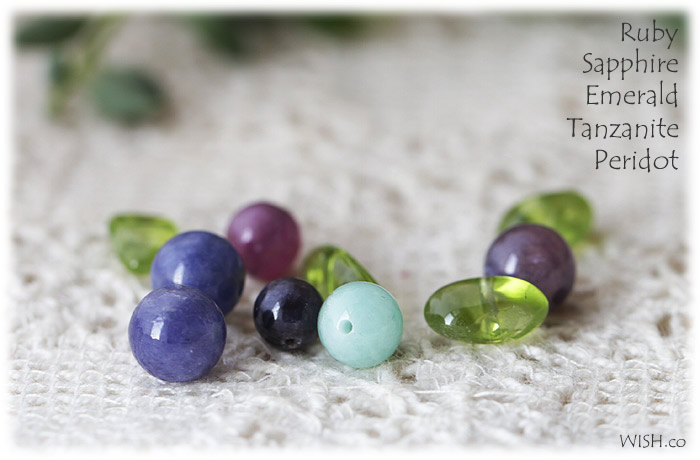 ルビー・サファイア・エメラルド・タンザナイト・ペリドットのビーズを集めたセットです。